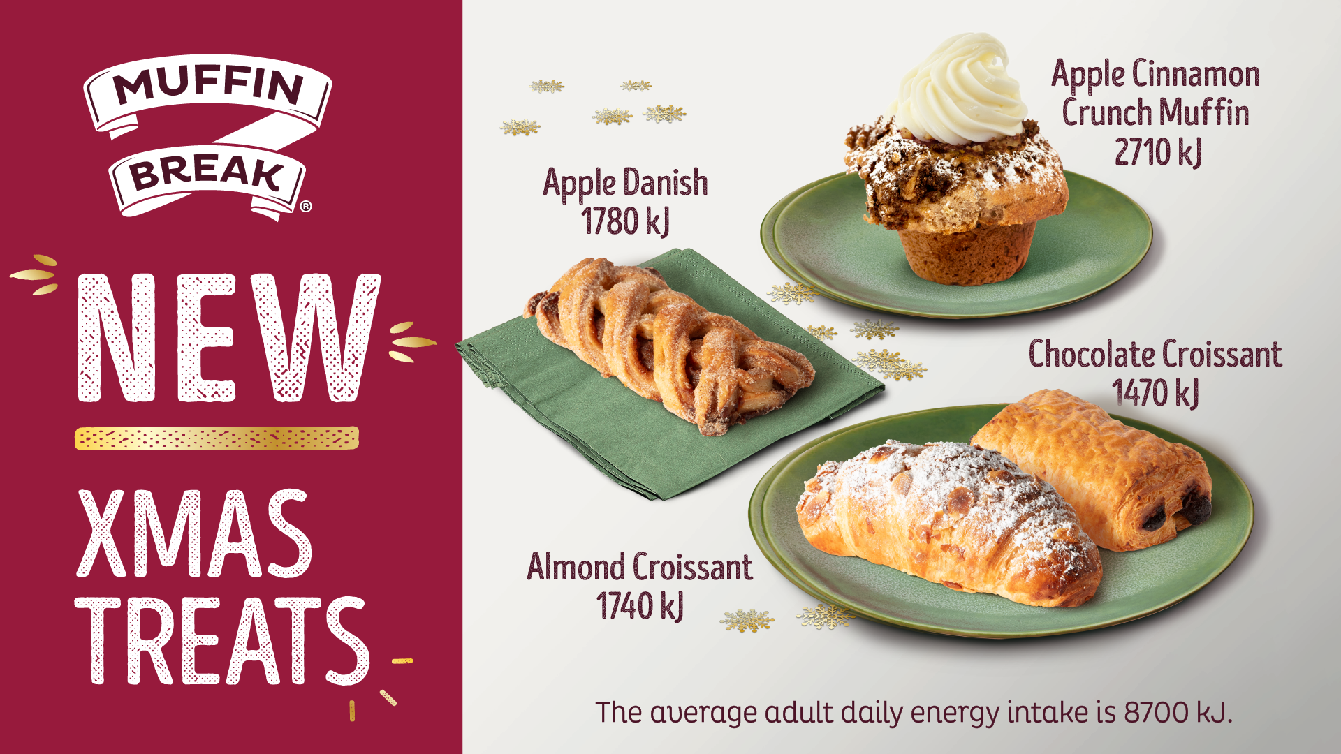 Muffin Break's Christmas Treats Wednesday, December 13, 2023 11:30 AM Sunday, December 31, 2023 11:55 PM Google Calendar ICS Tis the season for delectable delights at Muffin Break!Embrace the festive flavour with their Christmas treats lineup featuring the delicious Apple Cinnamon Crunch Muffin, Apple Danish, Chocolate Croissant, and Almond Croissant. See store